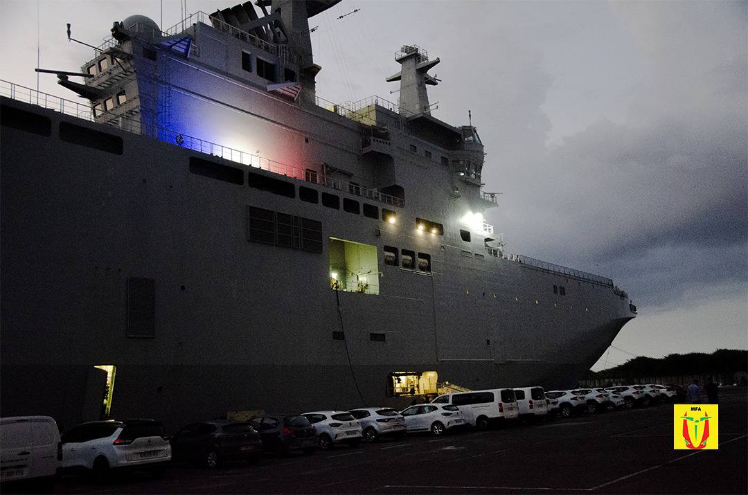 Teny amin'ilay sambo lehibe "Dixmude" ihany no nanatontosana ny valandresaka ho an'ny mpanao gazety ny tolakandro sy nanaovana ny lanonana fiarahana tamin'ireo mpiantsehatra amin'ny Tafika an-dranomasina avy ao La Réunion sy ny mpiasa ao anatin'ny sambo ary ireo vahiny sy tompon'andraikim-panjakana tany an-toerana. Ity sambo lehibe ity moa dia mahatratra 2050 taonina ary afaka mitondra sambo mpitondra fiara roa ao anatiny, fiara marobe, angidimby maromaro ary mahatratra 600 ny olona miasa ao anatiny andavanandro. Ampiasaina amin'ny fanaterana ireo fitaovana ireo sy ny fanaterana Miaramila frantsay🇫🇷 amin'ny toerana ilana izany izy ity.