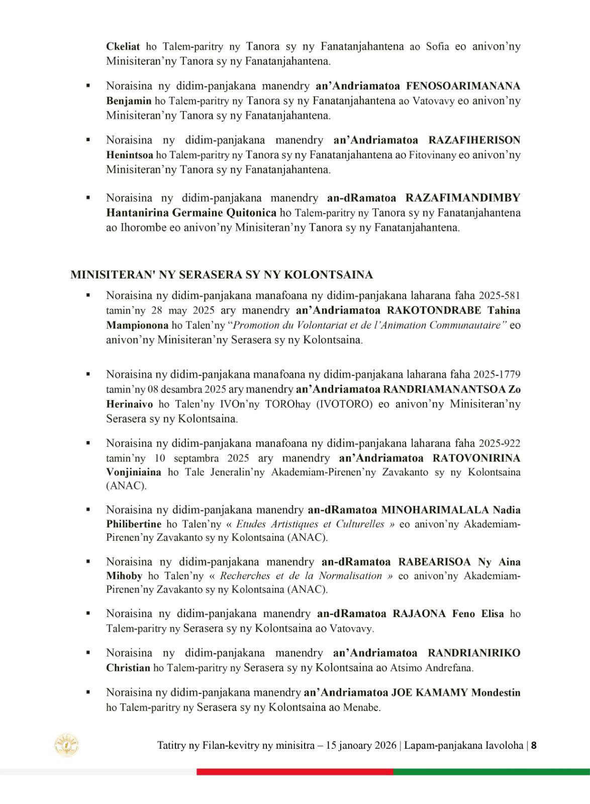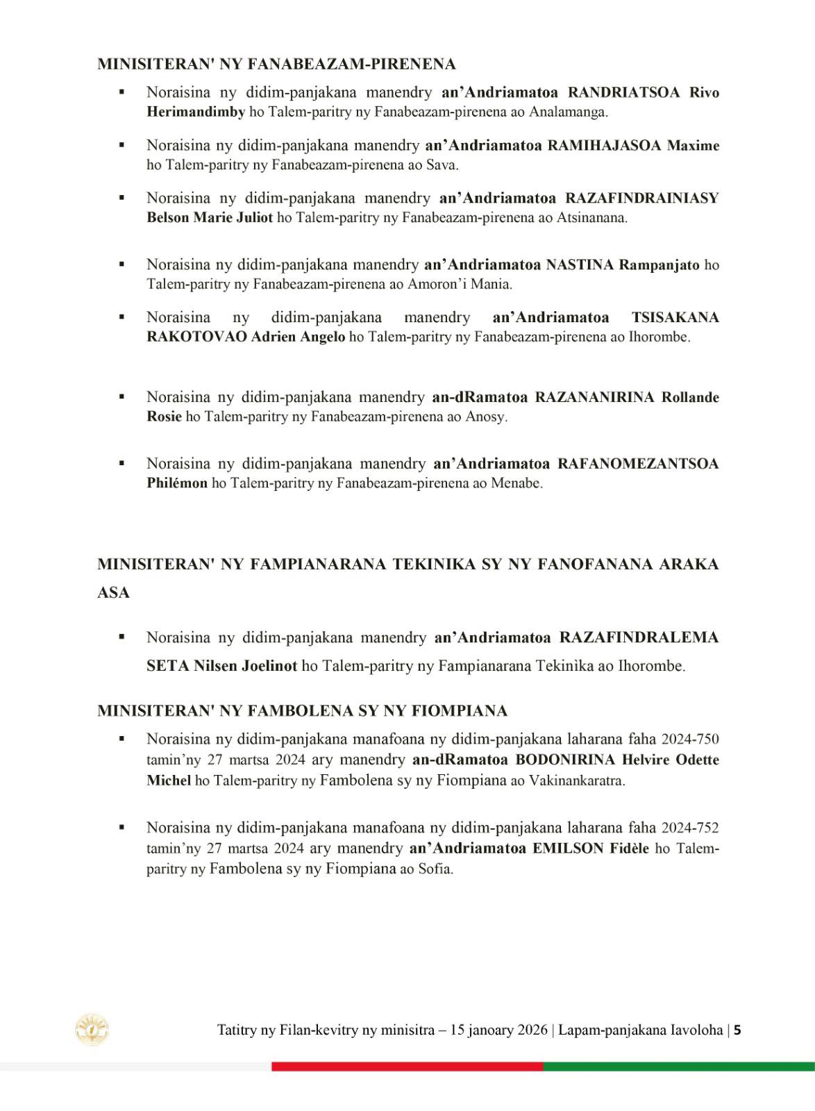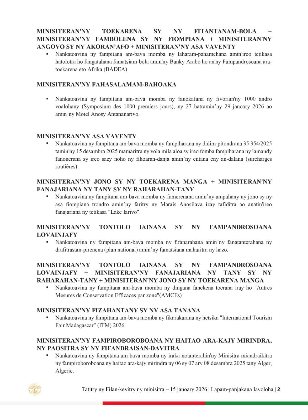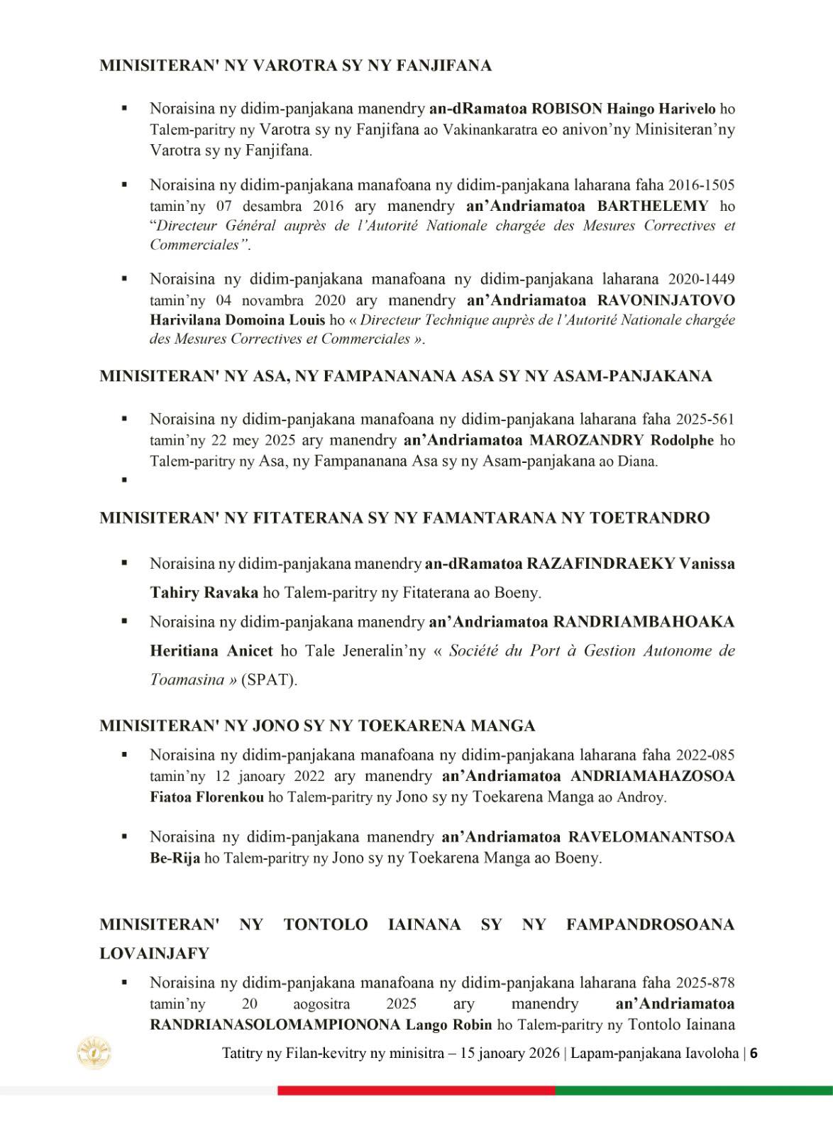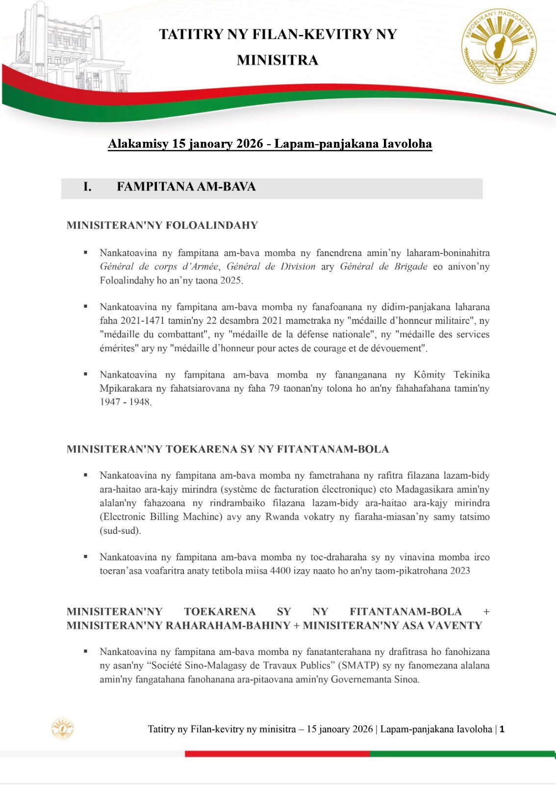 𝟐𝟕 𝐣𝐚𝐧𝐨𝐚𝐫𝐲 𝟐𝟎𝟐𝟔 | 𝐋𝐚𝐩𝐚𝐦-𝐩𝐚𝐧𝐣𝐚𝐤𝐚𝐧𝐚 𝐈𝐚𝐯𝐨𝐥𝐨𝐡𝐚 𝐓𝐚𝐭𝐢𝐭𝐫𝐲 𝐧𝐲 𝐅𝐢𝐥𝐚𝐧-𝐤𝐞𝐯𝐢𝐭𝐫𝐲 𝐧𝐲 𝐌𝐢𝐧𝐢𝐬𝐢𝐭𝐫𝐚.
