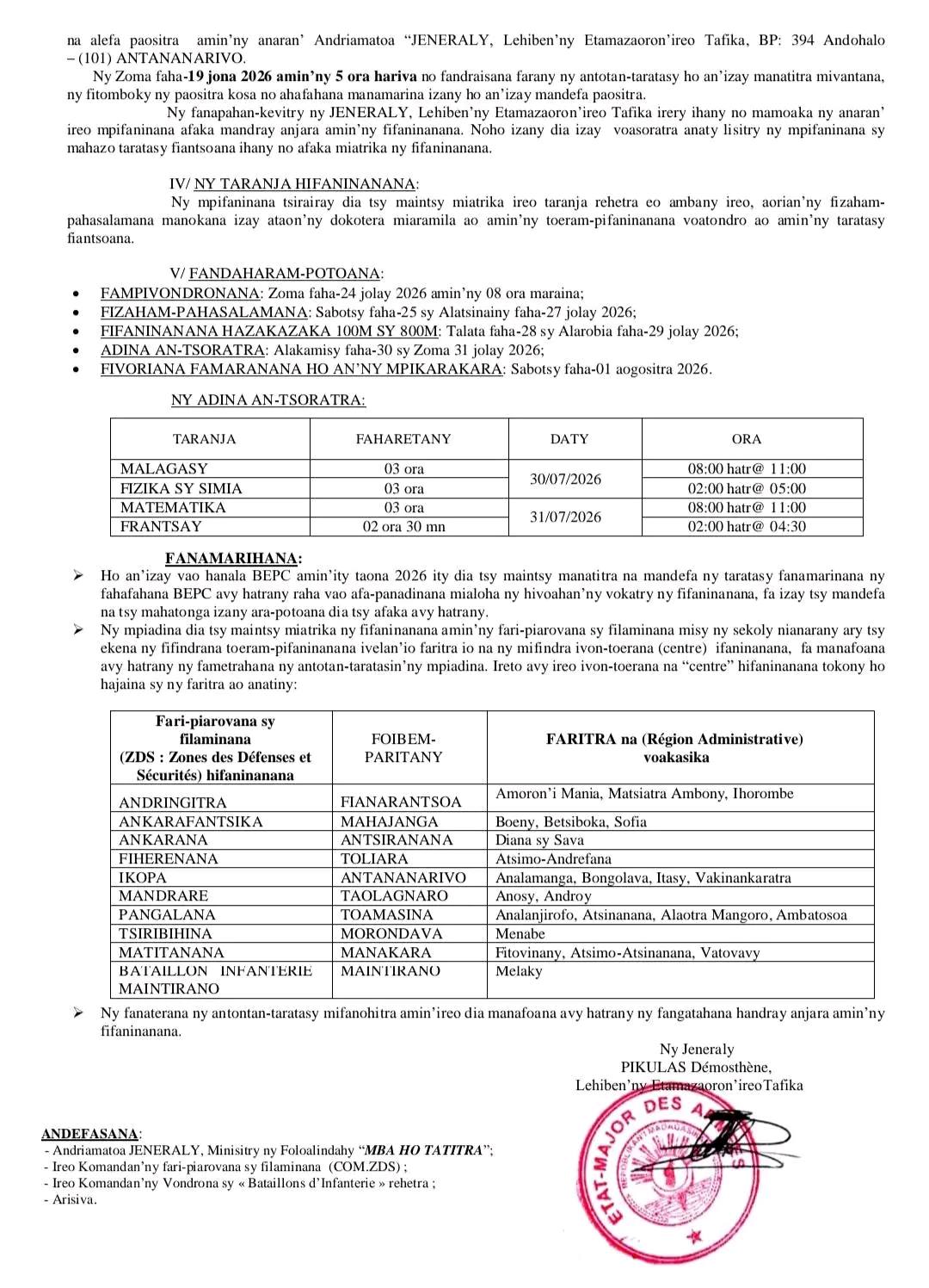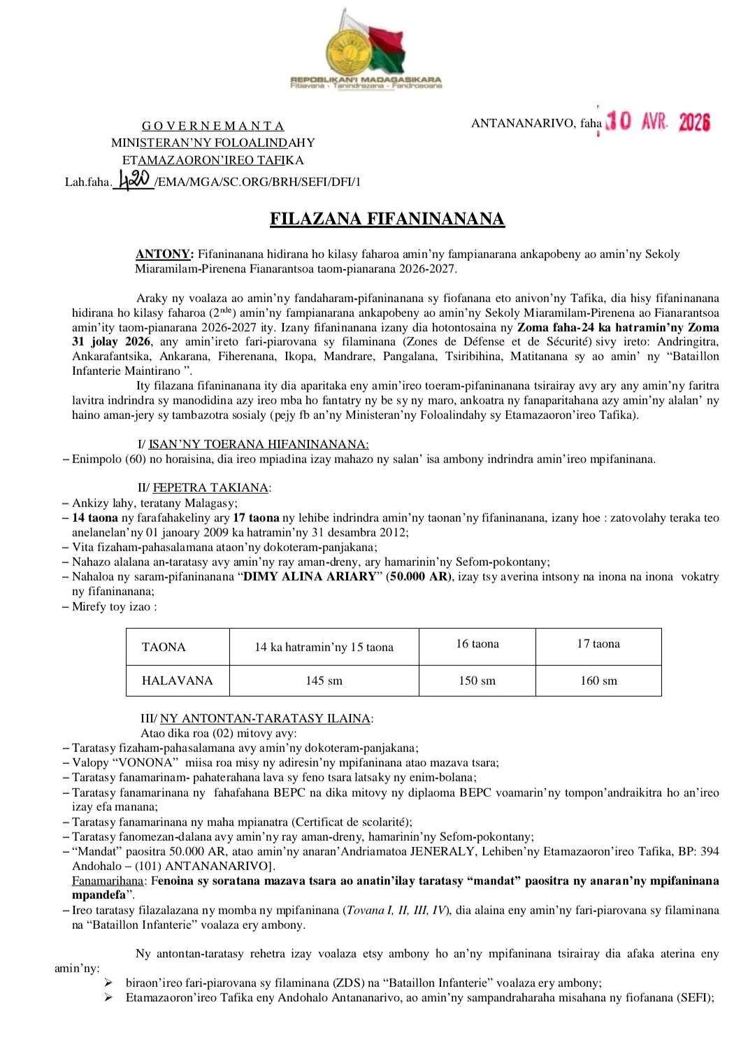 FILAZANA FIFANINANA SEMIPI FIANARANTSOA 2026 HO AN'NY TAOM-PIANARANA 2026-2027